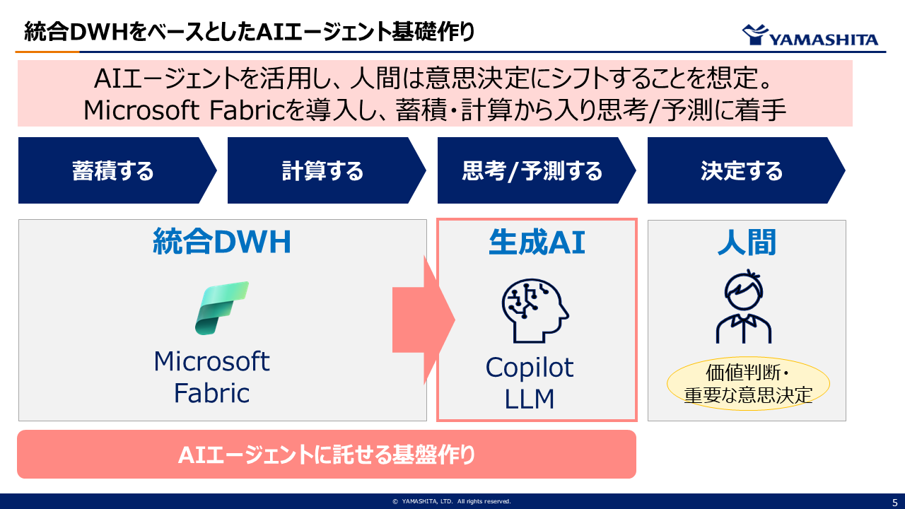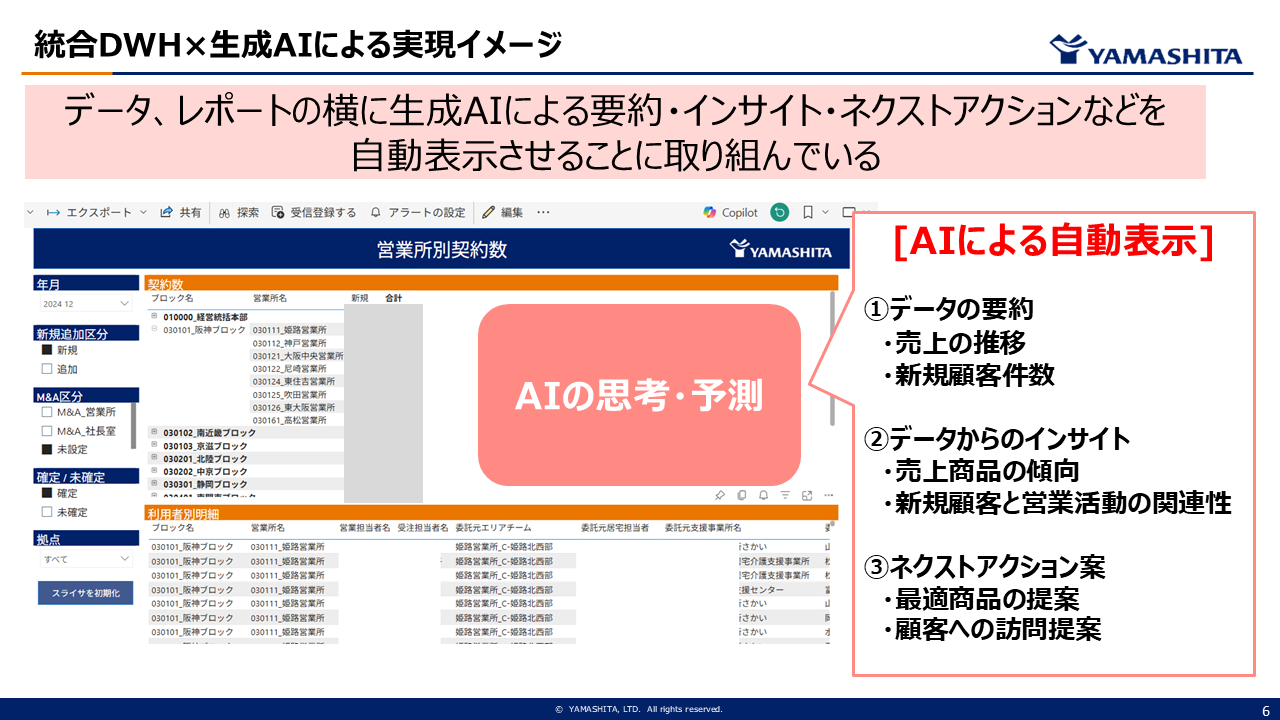 - Microsoft FabricでDWH統合。レポート脇に要約/洞察/次アクションを自動表示し、“思考の自動化”を推進。人は意思決定へ集中。