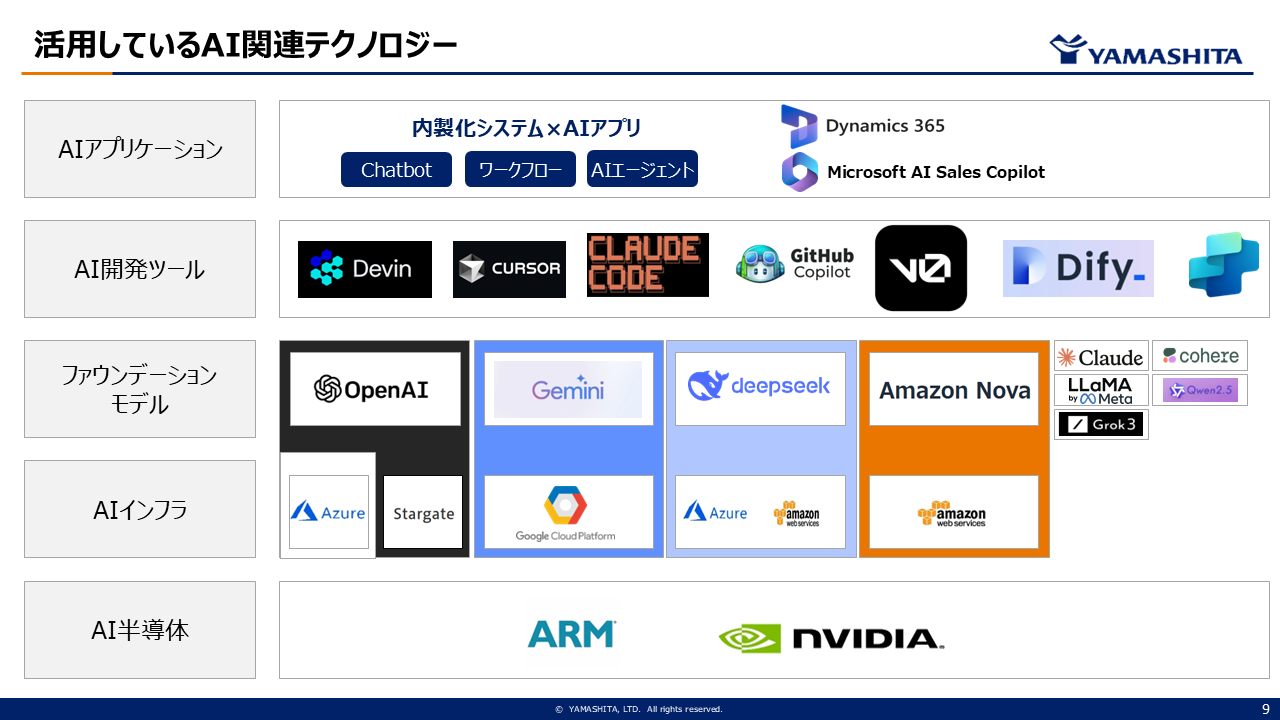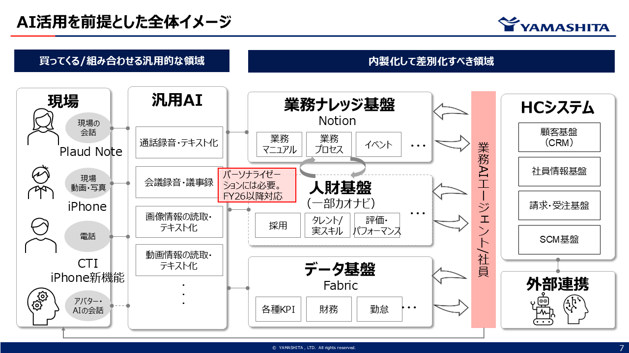 - 全社共通:AIファーストを前提に、「みんなが引き出す全人類の総叡智」を実現するため、AI活用できる土壌を作るため、アナログ工程の標準化・デジタル化を推進。また、全社員がAIを作る・育てることを念頭に、AIトレーナー(ナレッジを溜める)とAIを自分で作るローコード/ノーコード開発を推進。