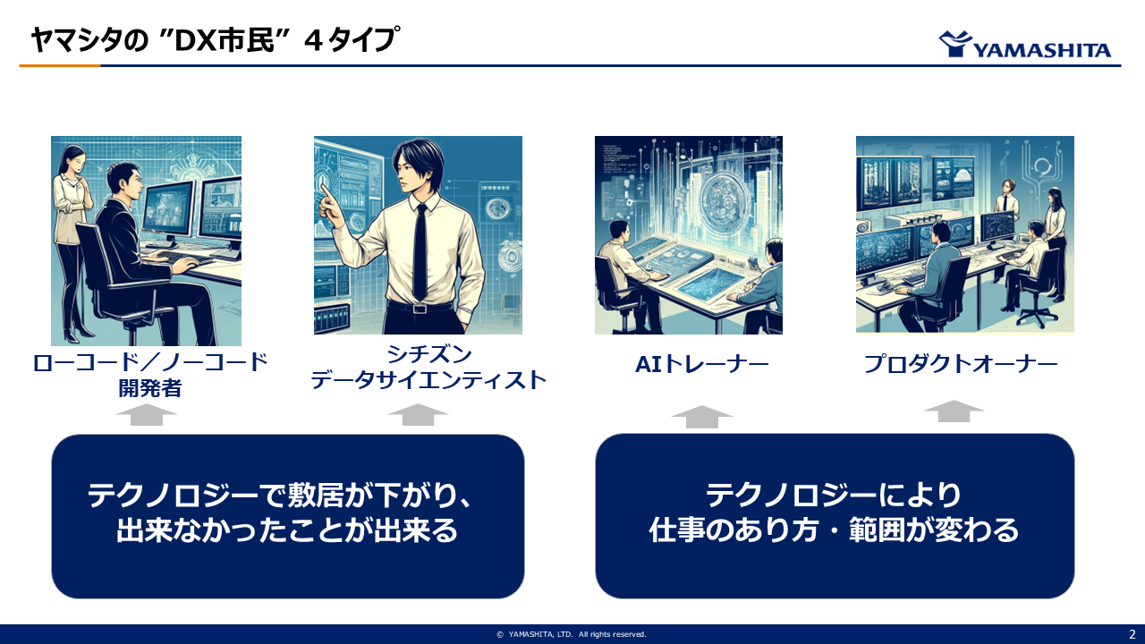非IT従業員の民主化においては、DX市民を4タイプとしてDX全体の底上げを図っていきます。