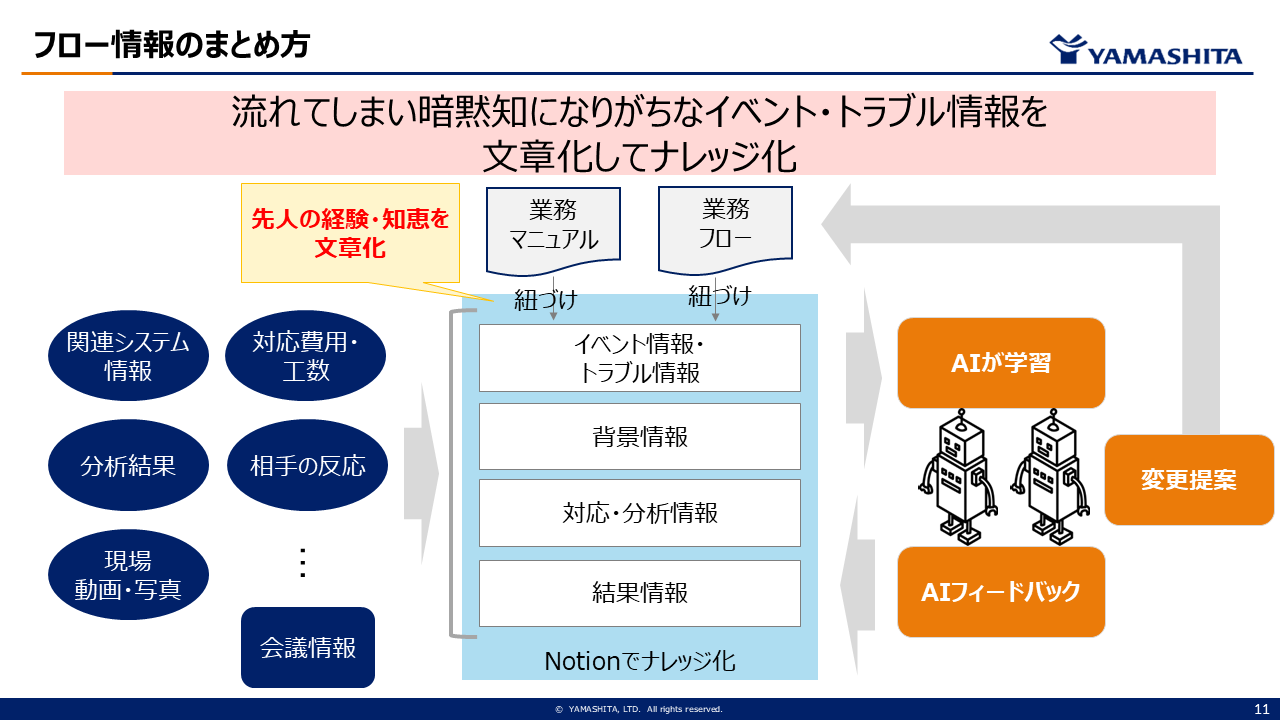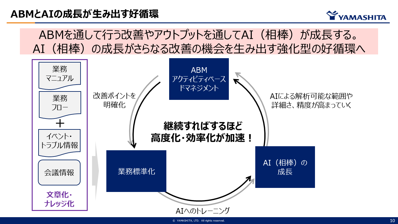 標準化 → 課題の可視化 → 改善生成 → AIの学習 → 再標準化のループを常態化。