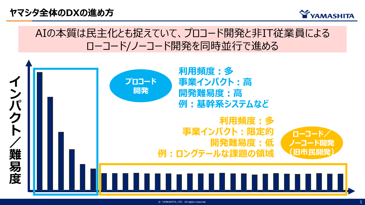 高難度のシステム構築はデジタル本部システム開発部の内製化エンジニアがプロコード開発し、非IT従業員はローコード/ノーコードでロングテールを刈り取る。この両輪を走らせデジタルの成果を最大化することを目指しています。
