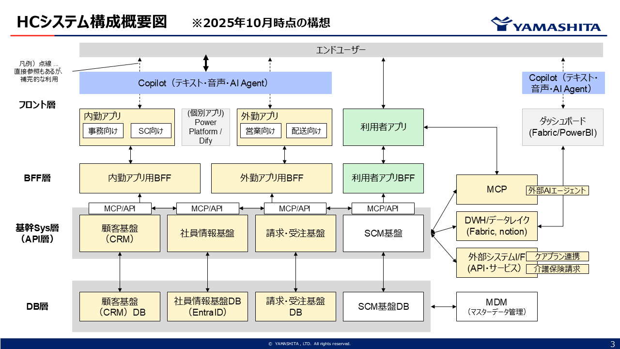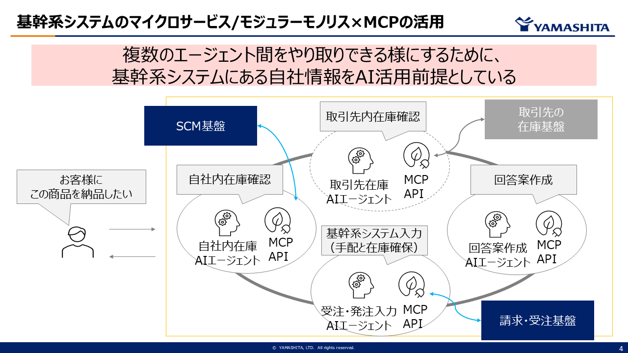 基幹は内製で刷新。MCP(Model Context Protocol)とAPIを標準I/Fに据え、将来の社内外AIエージェント連携を前提化。