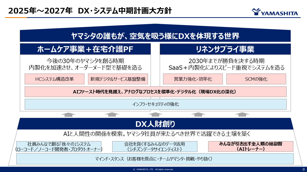- リネンサプライ:2030年が勝負所。CRM等は買ってくるべきところはSaaS導入でスピード優先、一方、SCMなど強みは内製化 × AIで高速化・差別化を拡張。