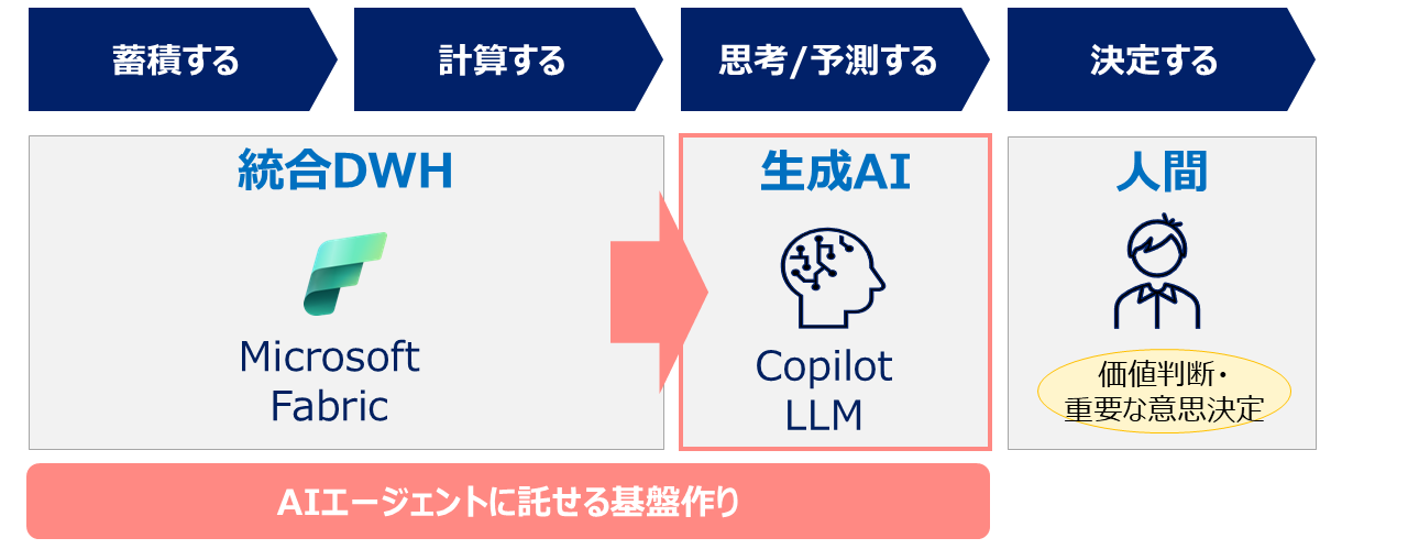 ホームケア事業部において、現状では各システムにあるデータをOneLake(Microsoft Fabricにおけるクラウド環境のDWH)に集約し、ユーザが望むレポートの作成、公開までとなっています。これからは集まったデータを元に、営業活動の貢献につながるAIエージェントの構築を行っていく予定です。