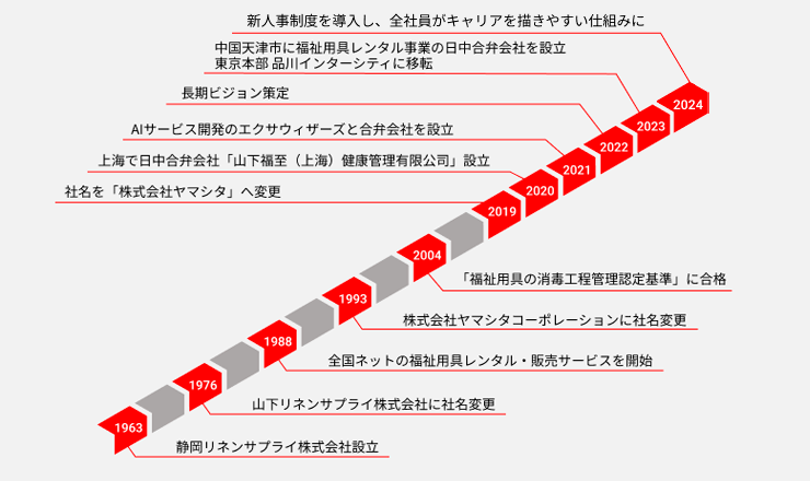 創業60年。従業員10名で始めた静岡リネンサプライ株式会社が始まりです。1986年には介護用品レンタル・販売サービスを開始。成長市場における質の高いサービス提供が実を結び、着実に成長を続けています。近年は中国進出、AI合弁会社設立など、長期ビジョン実現のための新たな取り組みを加速しています。
